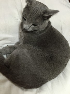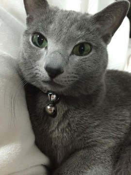 ロシアンブルーのオス。目はグリーンです。人見知りですが、絶対噛んだりしません。