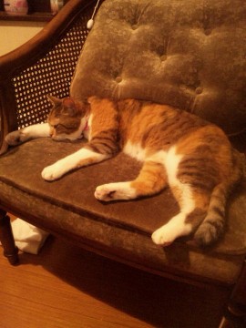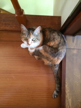脚やお腹は白、背中側は三毛猫のような模様です。尻尾はしましまですが、体や尻尾は舐めて毛が禿げたような部分が少しあります。