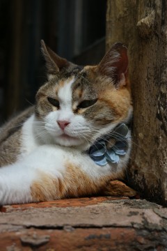 3.2キロで小顔。サクラネコではないですが両耳切れています。頭がツートンなのが特徴。人なれしていますが、抱っこは苦手。いなくなった日はブルーのお花の首輪をしていました。一枚目の写真はいなくなった日の朝です。