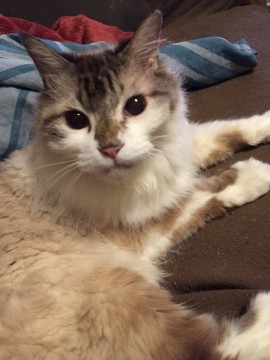 背中から尻尾にかけて薄い茶色が混ざっていて長毛の猫です。