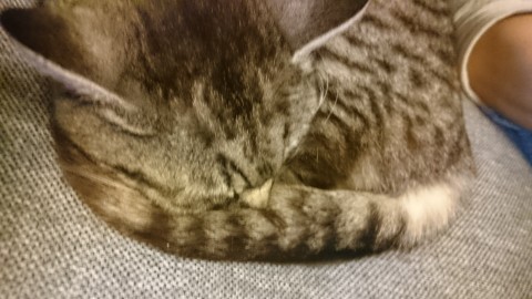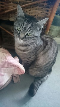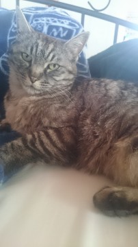 サバトラで人懐っこいです。尻尾は長めで現在右前足を怪我しています(かさぶた状態)