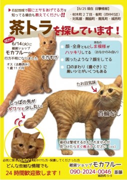 ★失踪し、チラシをポスティングしてから1週間が過ぎ10件程の茶トラ猫の目撃情報があり、都度駆けつけてはいますが発見には至っていません。