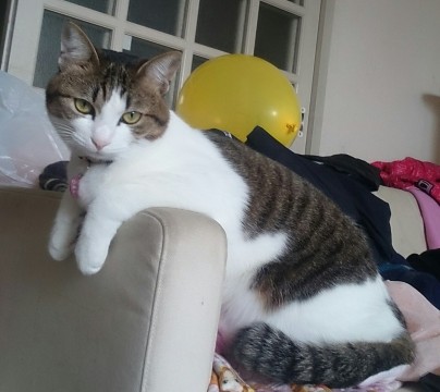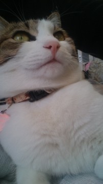 キジトラの白、メス、中肉中背、シッポ長いです。薄いオレンジチェックの首輪にピンクのハートの鑑札を付けています。『りっちゃん』の文字と私の名前、電話番号が書いてありますが、強くひっぱるとはずれる首輪なので、はずれて付けてない可能性もあらります。