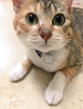 鈴のついた首輪、ペットホームのサイトで貰った迷子版がついています