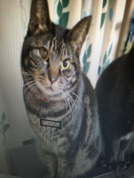 黒系キジトラ・顎が白くお腹の毛は黄色っぽいです。赤い首輪を付けています。
