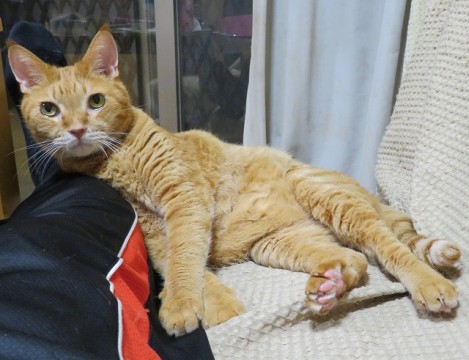 茶トラで口の周りだけ白っぽいです。シッポは長いです。去勢済み。