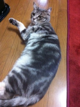 灰色、5kg、体でかくて顔小さい、尻尾長い、青と赤のシマシマの首輪(鈴とリボン)