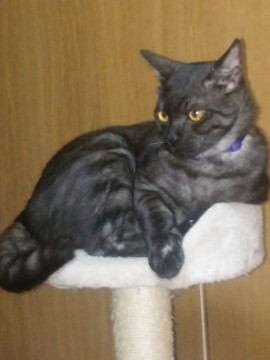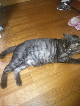 立っている時は黒縞模様しか見えないけど、毛の根元は白で中間がグレーで少し珍しい毛の色をしてます。