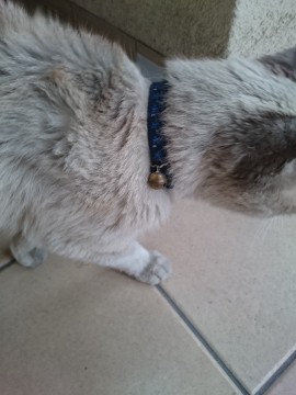 紺地に青い模様の鈴付き首輪。
