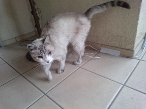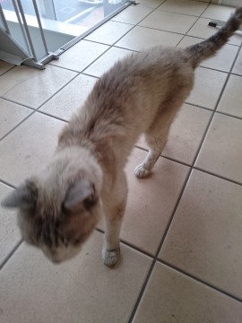 体は、だいぶ汚れているので判別難しいですが、背中が茶色がかったグレー、お腹や足は白っぽいです。
