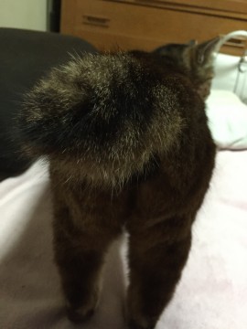 短いかぎ尻尾のキジトラです。ブルー系ラメカラーの首輪をつけています。
