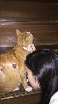 胴体を引っ掻いて、血がでて化膿している状態です。