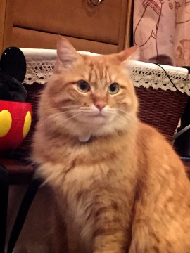 茶トラ、長毛、口の周りが白い、茶色のトラ柄の首輪、やや太りぎみ、尻尾は長め