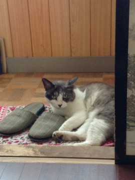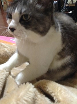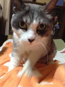 雑種。グレー系ハチワレです。尻尾は長さ10センチ程。目は黄色。避妊済。首輪はありません。