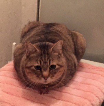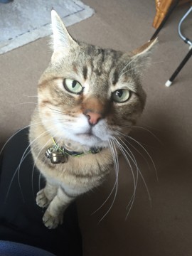 短いしっぽ、小太り、茶、グレーのトラ柄、黄緑の蛍光色の首輪に鈴をつけています。