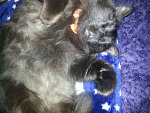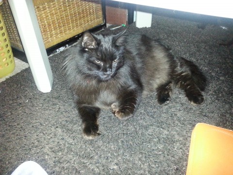 黒い猫。毛が長い。手足が短い。おなかの毛が白っぽくふさふさ。普通の猫より大きな太った猫。しっぽは、長く毛がふさふさ。赤い首輪