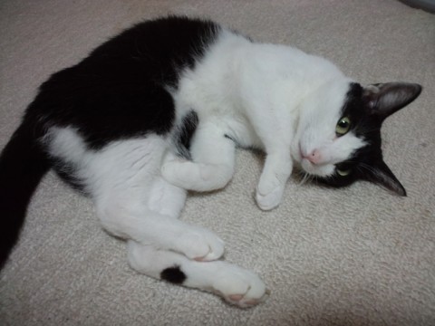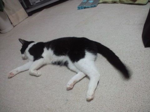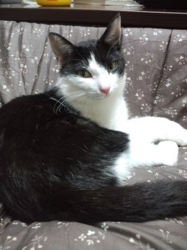 痩せ型(2.5kg)のブチ猫(白黒)で、左後ろ足のウラに黒く丸い模様があります。背側から見るとほぼ真っ黒で、首の周りに首輪のように白い毛があります。甲高い声で鳴きます。尻尾はまっすぐで長いです。