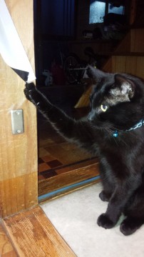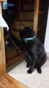 真っ黒で、水色の首輪と、水色と鈴をつけています