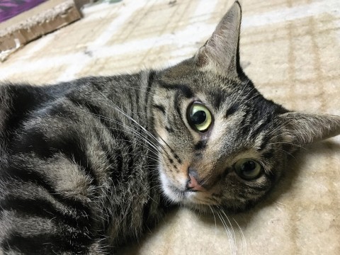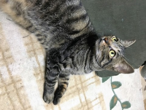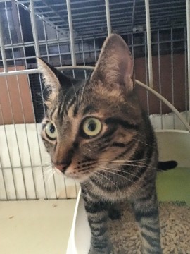 全体に黒っぽいキジトラです。白いのはあごの周辺だけです。