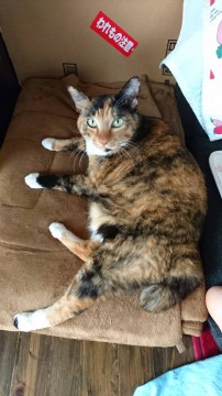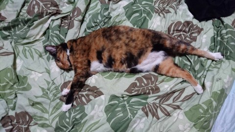 オレンジ・茶・黒が混ざった三毛猫のような尻尾の短い雑種の猫です。お腹と顎の下あたりまでが白いです。