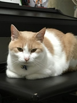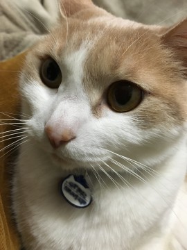 白地にベージュに近いぶちが入っています。取れていなければ青色の首輪に鈴と名札がついています。基本的には怖がりですが、人嫌いではありません。