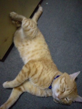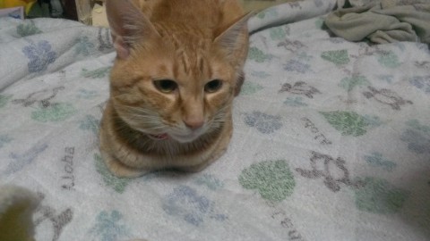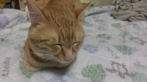 キジトラで目の上のけが薄いです。よく自分のしっぽをしゃぶります。しゃぶりながら寝ます。とれてなければダニ避けのピンクの首輪をしてます。