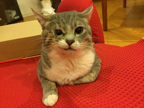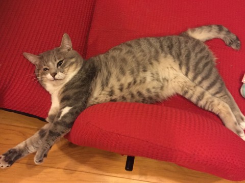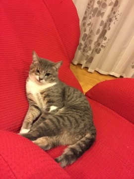 グレーの縞々模様に真っ白な胸とお腹。右目がまばたきできません。座るときに右足をなげだします。