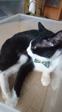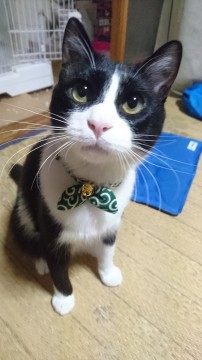 はちわれ/鍵しっぽ/左前足にぶちあり/両耳付近の毛が少ない/唐草の首輪/少し重め/鳴き声高い方