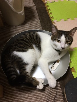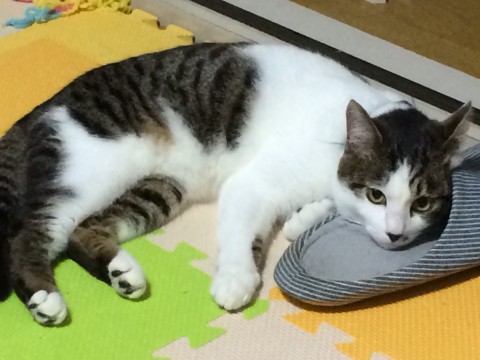 白サバのmixで緑の鈴付き首輪してます。尻尾は長く黒で真っ直ぐです。