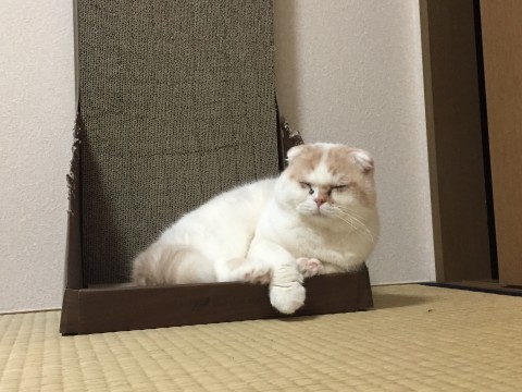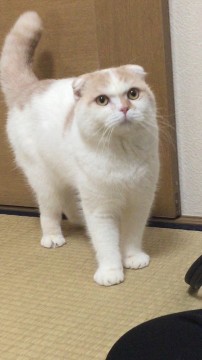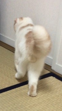 体の特徴:太いしっぽ、丸顔、丸い目(金色で涙焼けあり)、折れた耳、内股