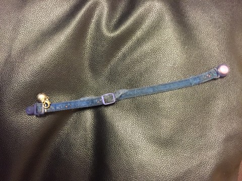 茶トラの、ややふくよかな青い鈴付きの首輪。