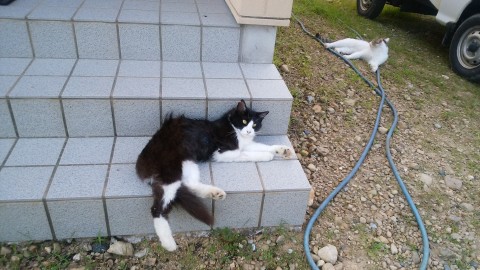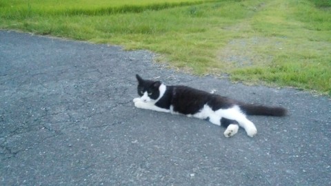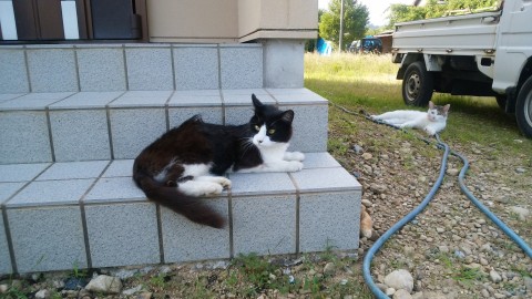 黒白のハチワレです。右耳にV型の切り込みあります。避妊済みのしるしです。