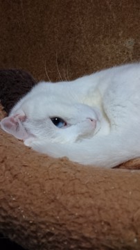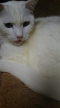 去勢済、全身白、体重5㎏くらい、やや長毛、オッドアイ、尻尾は長くて真っ直ぐ、青い首輪をしています。