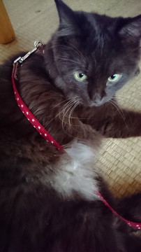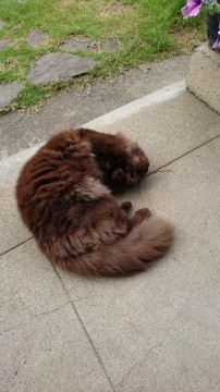 こげ茶色で、お腹部分が白っぽい長毛の猫です。ちょっと肥満気味で体重は4~5kgぐらいです。首輪はしていません。避妊手術済み