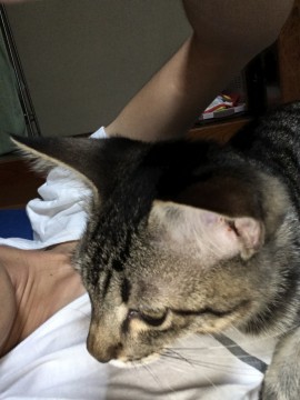 キジトラの青い首輪をしてます。
