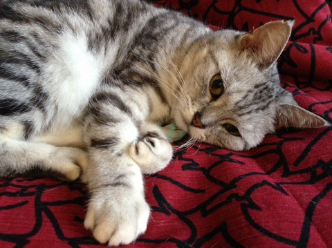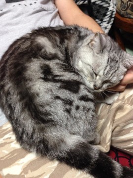 アメショーのメスでピンクの首輪(リボン)をしています。