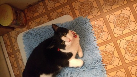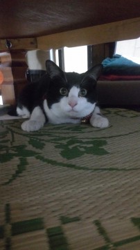 ハチワレで涙やけが少々、、尻尾は短く10㌢も無いですが触ると微妙に鍵尻尾です。また、体長はかなり小柄です。