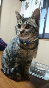 キジトラ 、小柄 、尻尾は真っ直ぐで長い。