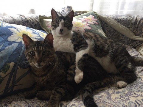 一匹はキジトラ+白で体重6kg、少しカギ尻尾、