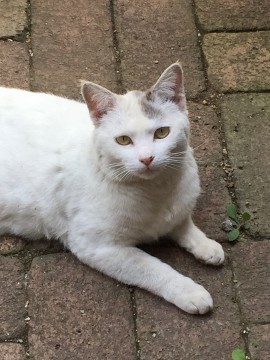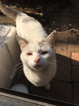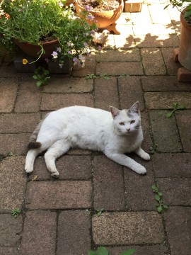 全体的に白くシッポはグレーの濃淡の縞模様、頭左側グレーのブチ模様、背中後方にもブチ模様があります。3キロない小さめの子です。