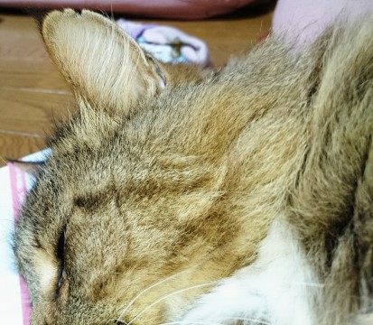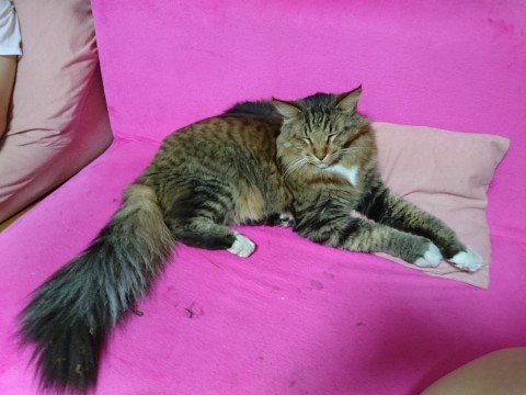 シッポが太くフサフサしていて、左耳がジバニャンみたいにかけていて、手足の先が白く、人懐っこいです。