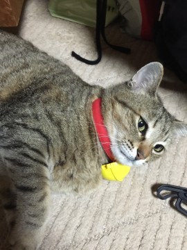 焦げ茶色のゴムの首輪に直径2センチ程の金色の鈴、白い生地にピンクの肉球の刺繍がされているチャームが付いています。そのチャームの裏に消えているかもしれませんが、名前・電話番号が記載されています。