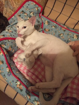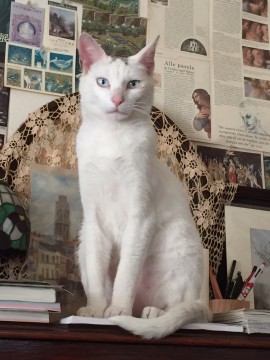 白猫で頭にグレーの2本線(キトンキャップ)、ブルーの瞳、体格がしっかりしています。首輪はしていません。去勢手術しています。