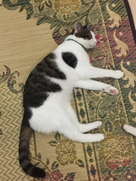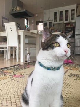 キジ白で手足お腹は白。顔はハチワレ。背中はキジ柄。しっぽは黒。首輪はビーズの水色。外れている可能性あり。