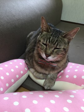 青赤白のトリコロール柄の蝶ネクタイの首輪