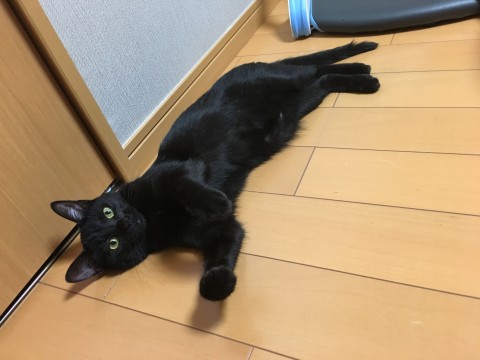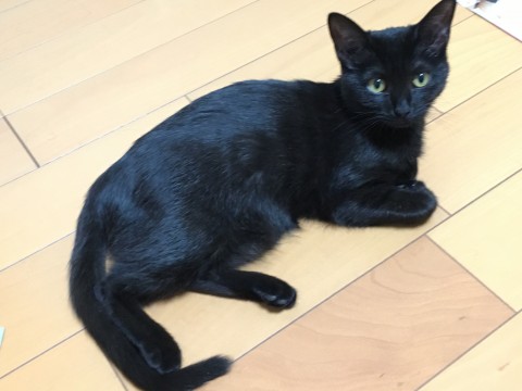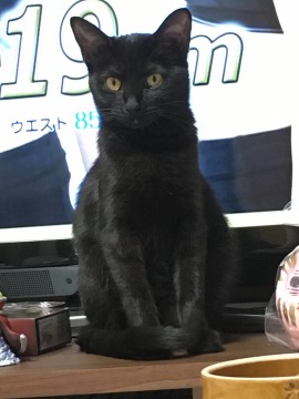 尻尾の長い黒猫のメスです。