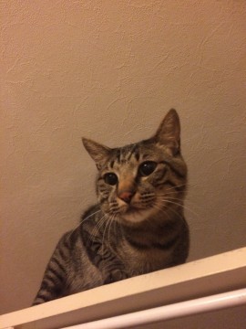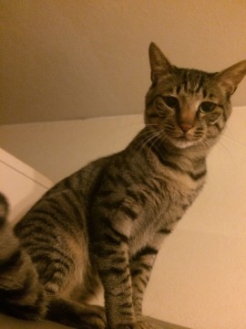 細身のキジトラです。耳がピンっと大きく立っています。