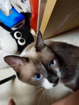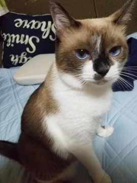 たぬきのような猫です。白と茶色の模様で目は青くて少し太めです。