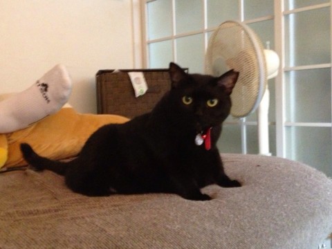 四肢もしっぽも短めで、避妊済みの太い黒猫です。黄色のクリクリした目です。左耳カットがあります。