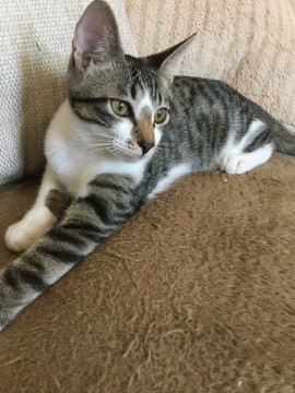 キジ白の子猫です。体長約30cm、細身。鼻の周りとあごの下が茶色いです。尻尾の先がカギしっぽになっています。